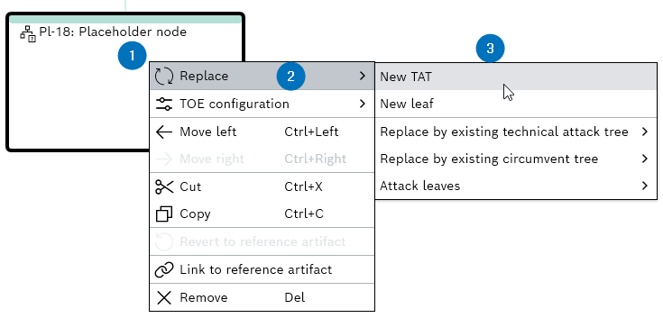 You can replace the placeholder node with a new TAT, new leaf, or Attack leaves. You can also replace it with an existing technical attack or circumvent tree.