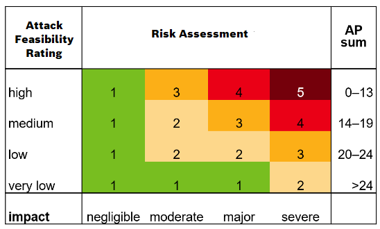 The risk for a given threat scenario is determined from the AFR of the associated threat and the impact of the associated damage scenario according to the risk matrix (see figure below) by a simple table look-up.