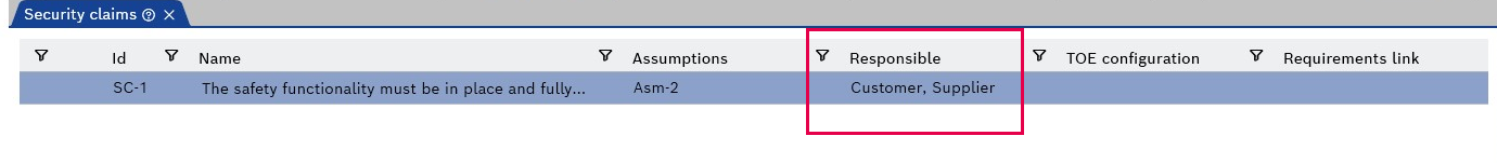 Security claims resulting from one or several assumptions must be linked with the corresponding assumption(s). Moreover, a responsible must be specified. This is typically a customer, or a supplier, further parties may be added.