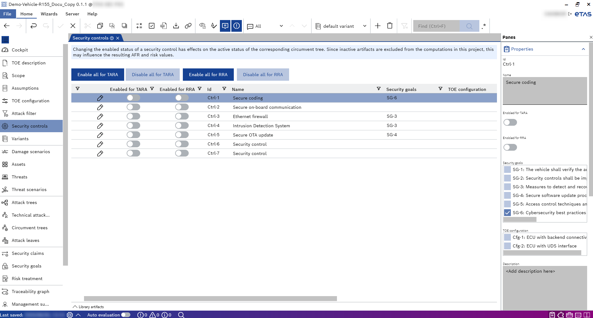 The Security controls allows you to enable or disable the security controls for all TARA and RRA projects. Changing the enabled status of a security control has effects on the status of the corresponding circumvent tree. The disabled artifacts are excluded from the computations, which may influence the resulting AFR and risk values.