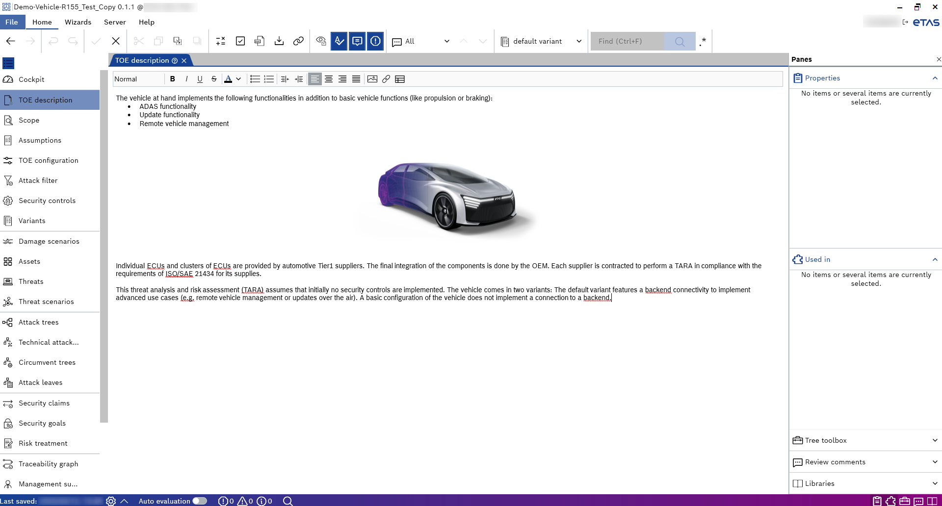 CycurRISK provides basic formatting, tables, graphics, and links for the TOE description. |