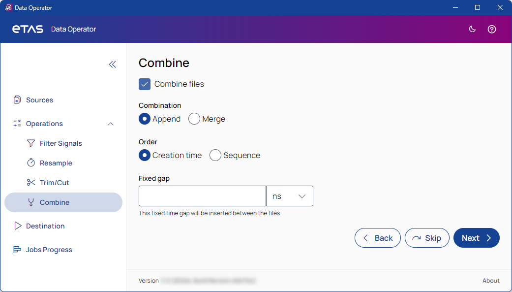 Merges the data from the job's files depending on their time stamps on the same timeline into a single file.