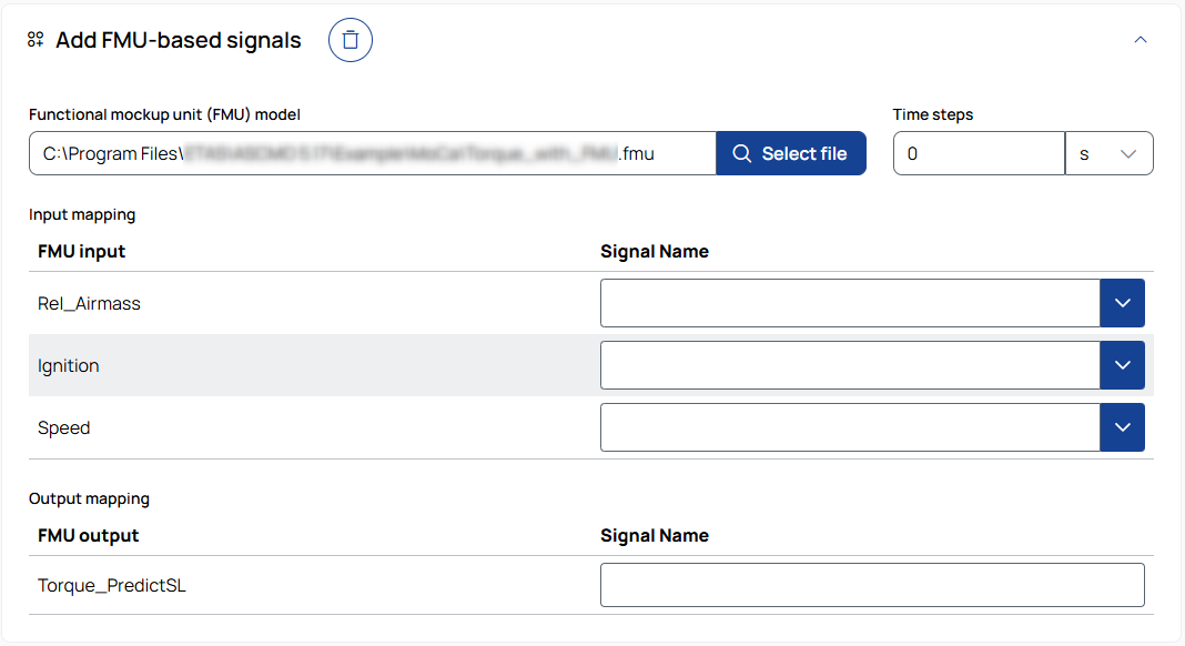 FMU-based signals may replace existing signals with the same name. Changing the FMU file resets all input and output mappings. |