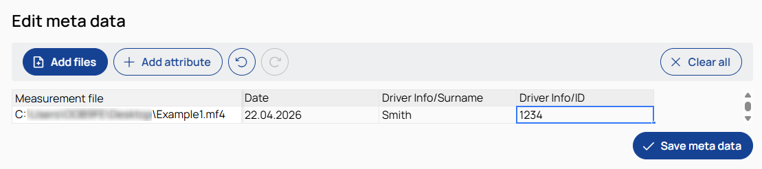 The Edit meta data page provides a centralized interface to view, modify, and add meta data of multiple measurement files in a table.