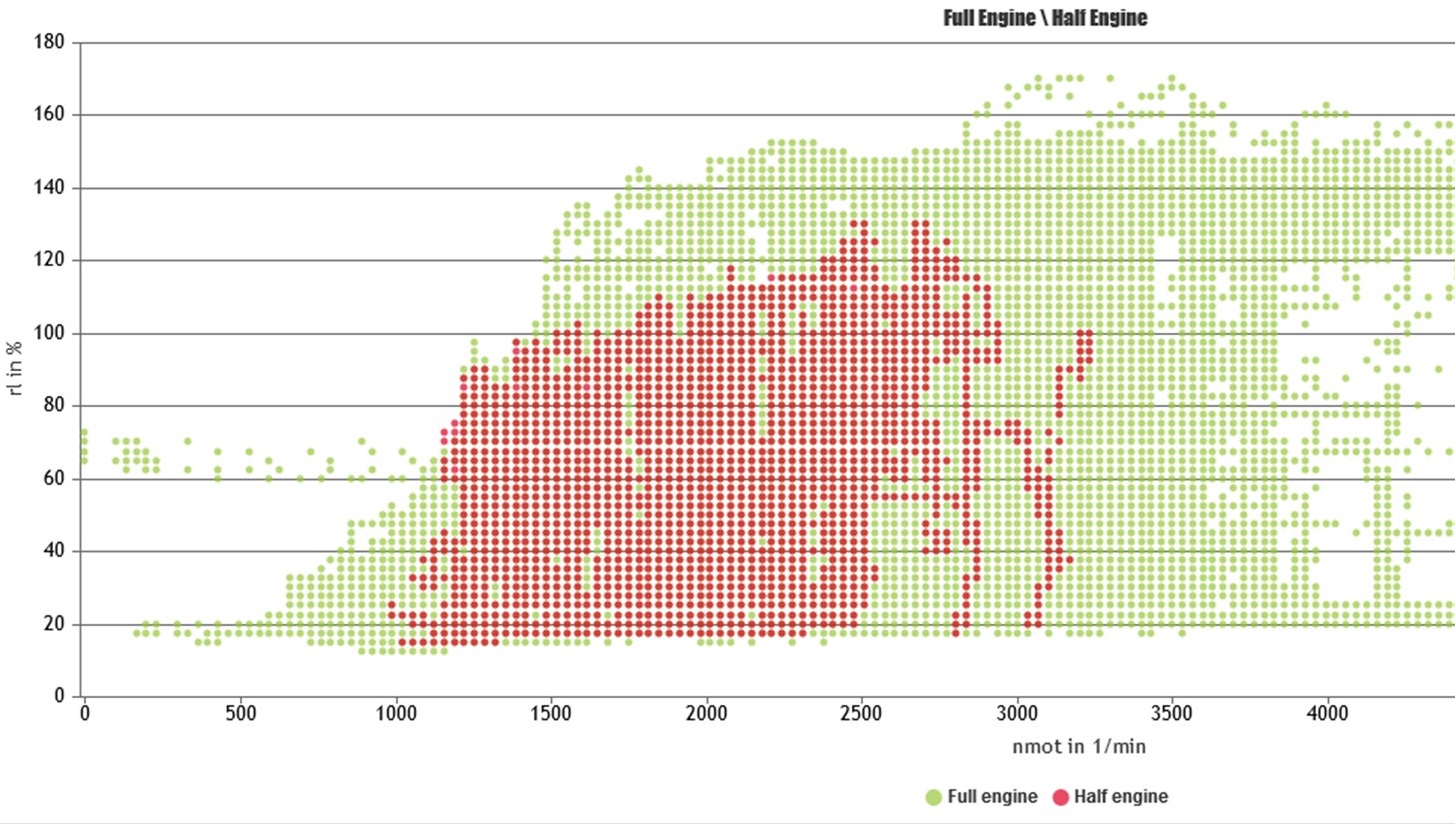 In this example, the engine speed (nmot) is shown on the x axis and the air charge (rl) on the y axis. The plot also has a child shown in red. The red points are the data points when the engine is running in half-engine mode. The green points are the data points when the engine is running in full-engine mode.