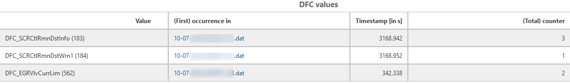 Special table type for detecting and reporting the diagnostic fault checks (DFC). Each row contains the DFC value, the file where the status first changed to this DFC value, the time stamp of that change, and the counter of all status changes to this DFC value. This table type can only be configured with the EATB Worker MATLAB license.