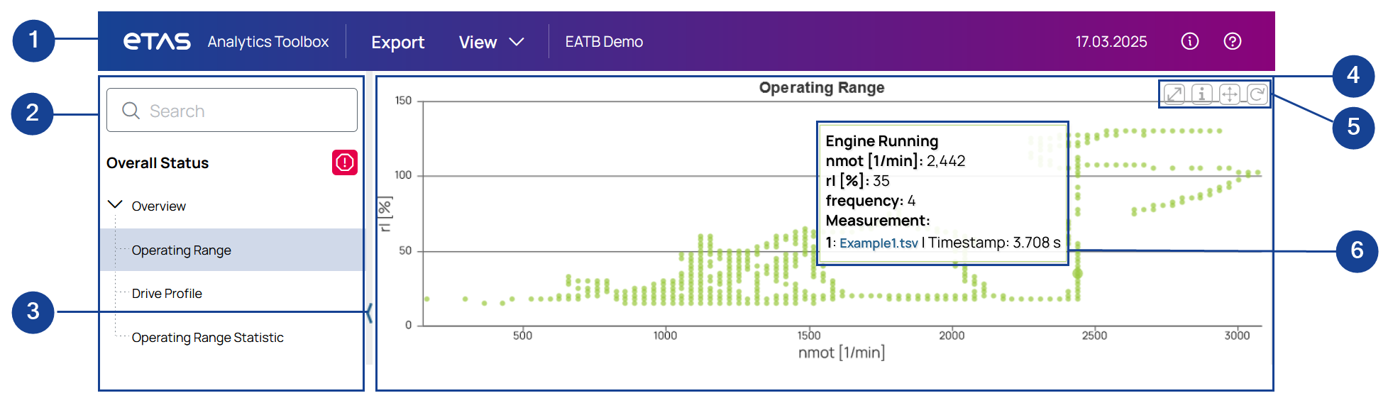 Toolbar: Get general information about the complete report, export the complete report, or adjust the settings for all display objects in the report.