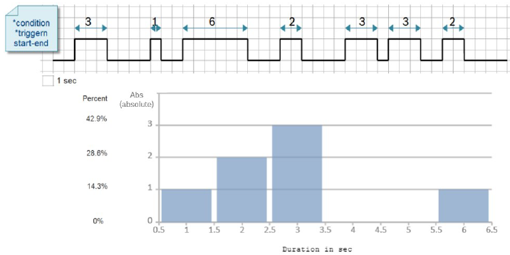 Overview of the duration of a defined event shown relative to the data samples selected by the intervals. You must specify at least one condition or two triggers (start+end), otherwise you get the view of value / percent.