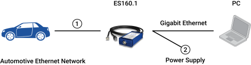 The ES160.1 is designed to connect to an Automotive Ethernet Network, a PC and an external power supply.