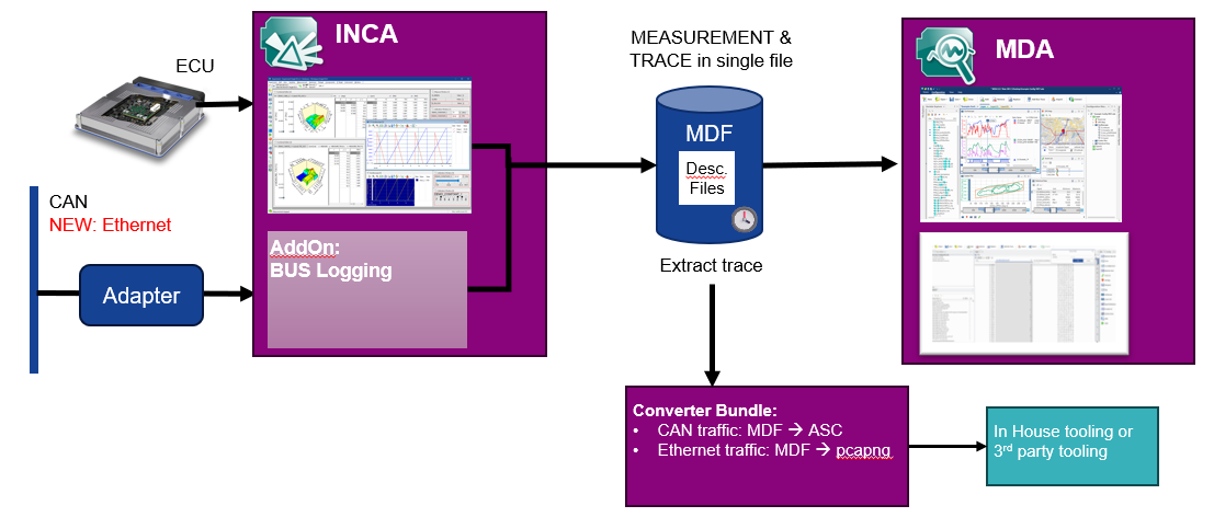 The INCA-Bus-Logging Add-On additionally includes a converter that reads MDF files and writes CAN traces into an ASC file.