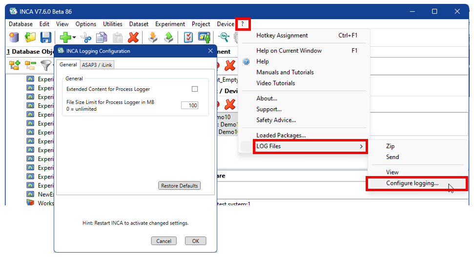 To simplify the logging configuration, INCA now offers a dialog that shows all logging settings.