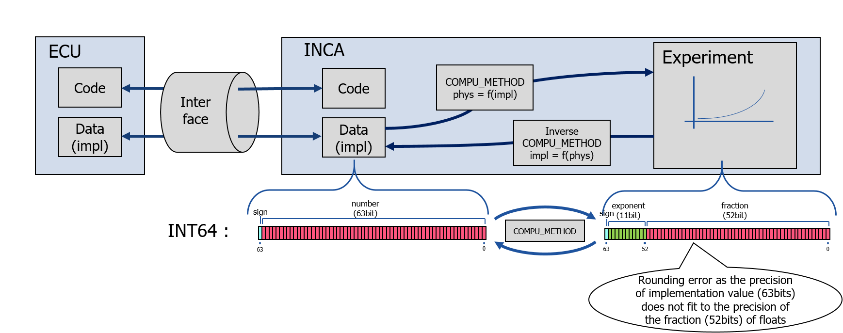 When INCA converts the ECU implemented values to the physical model, INCA uses variables of the data type double (float) with a cast mechanism. However, there are some restrictions for large values that need more than 52 bits from the 64 bit integers. The data type double offers only 52 bits as mantissa. The remaining bits are used for the exponent and the sign. This means that large values can be transferred to double but precision may be lost since the lower bits are cut of by casting.