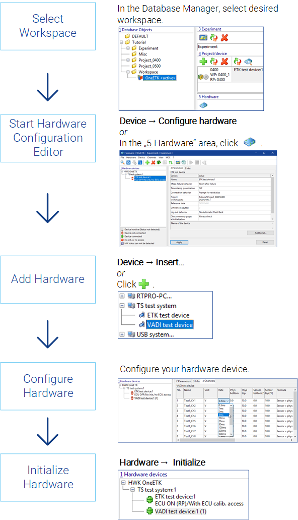 You can select different settings, for example, module parameters, channel settings, etc., for each hardware component using associated dialog boxes. When you add hardware components manually, the hardware still needs to be initialized.