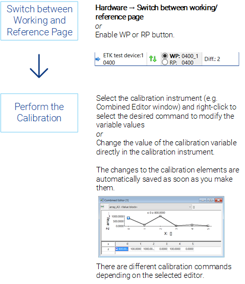 The following editors are available: Calibration Window (numeric, slider or bit display), Calibration Table, Scalar Table Editor, Combined Editor.
