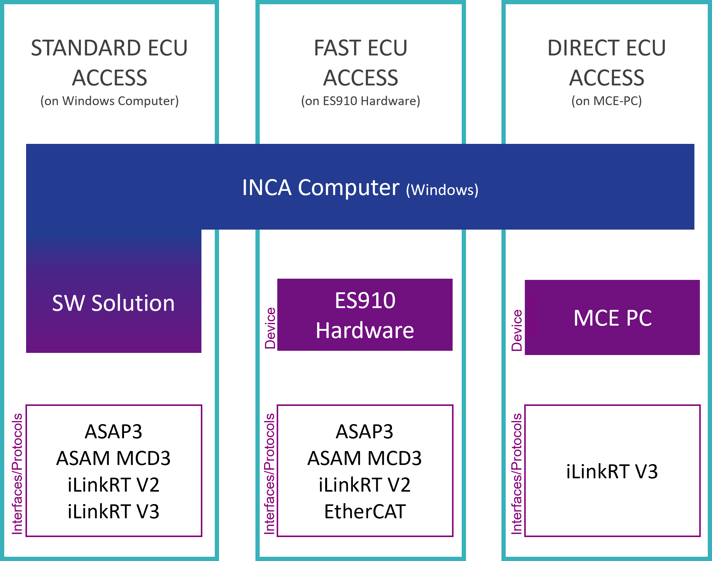 The INCA-MCE (Measurement and Calibration Embedded) and the INCA-MCE-RT add-on establishes a real-time connection between the test bench and the control unit via various interfaces and protocols. The main advantage of the INCA-MCE solution is the high throughput of measurement and calibration values.