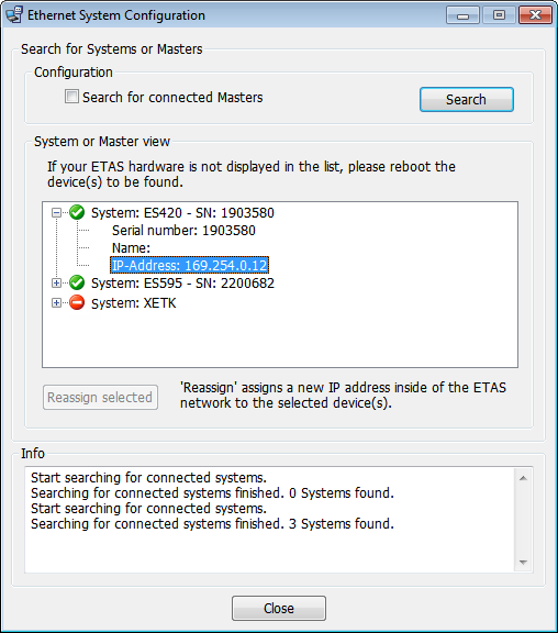 , the system can be found, but communication is not possible, e.g. because the IP address of that system is located outside of the IP address range for ETAS hardware.If the list is empty, the IP Manager could not find any Ethernet measurement and calibration hardware.