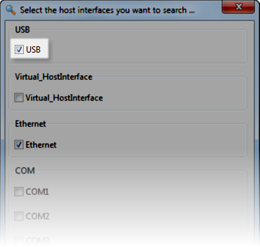 Did you select the required host interfaces (e.g. Ethernet, USB, COM) when you were searching for hardware?