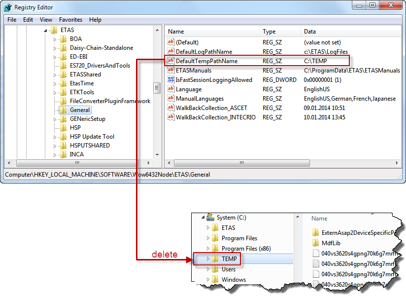 HKEY_LOCAL_MACHINE\SOFTWARE\Wow6432Node\ETAS\GeneralIn this folder, you will find the entry "DefaultTempPathName". The value of this entry indicates the location where INCA saves the TEMP files.