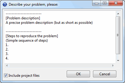 Make sure that you tick the checkbox Include project files. Then enter a description of the observed problem and click OK.