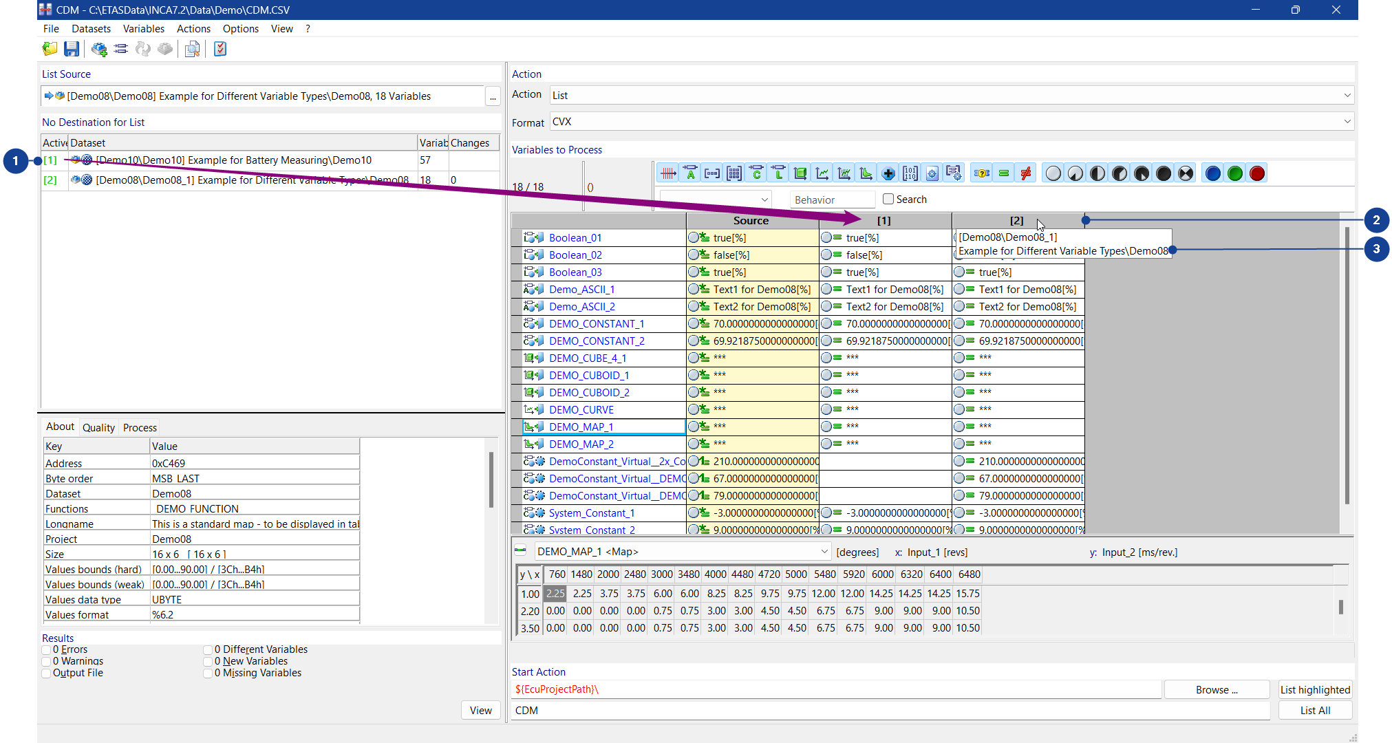 Connect to asap2 project | Opens a dialog where you can select an ECU-Project (A2L) from the INCA database. The data from the data exchange file are combined with additional information from the ECU-Project (A2L), for example, Data Types, Long Names. If the source was successfully linked to the project, the Source for Action field will display the project symbol. |