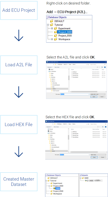 Prerequisites for calibrating with INCA are creating a memory image of the electronic control unit and storing the information in the form of datasets in INCA.