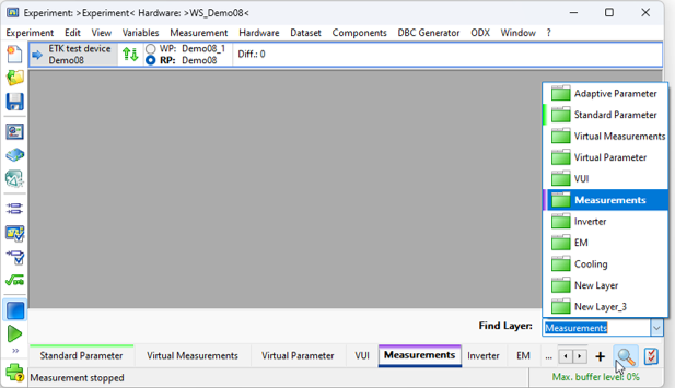 The Find Layer combo box in the INCA Experiment Environment module can be accessed in several ways: