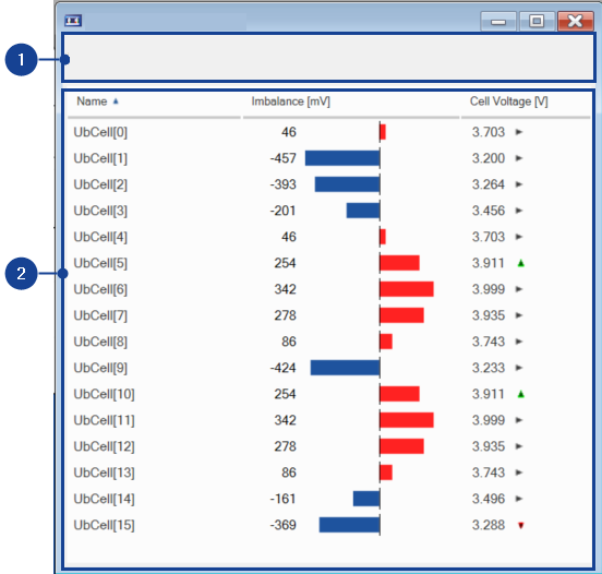 Displays the imbalance of the variable value, for example voltage imbalance of battery cells. The imbalance bars displayed for each measure variable are colored red or blue.