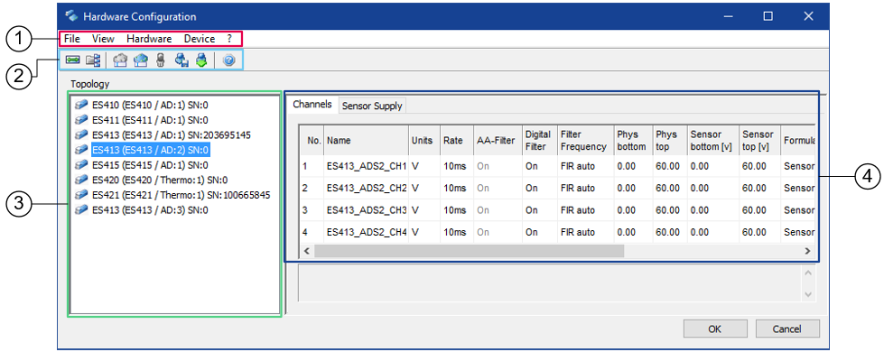 The Hardware Configuration Window of the Daisy Chain configuration program consists of the following components: