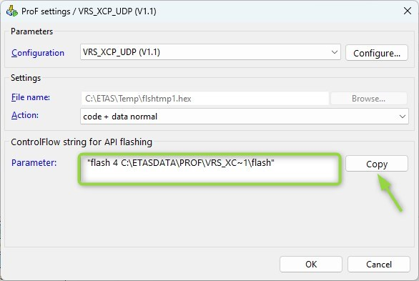 Install and select the ProF configuration to be used for API flashing > configure its parameters to be used for API flashing > press Copy and insert the string in your API script.