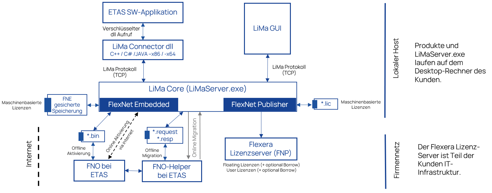 Der ETAS Lizenzmanager (LiMa) verfügt über einen einzigen LiMa Core (LiMaServer.exe), der als x86 C++-Komponente aufgebaut ist und es ermöglicht, mehrere ETAS-Anwendungen auf verschiedenen Plattformen zu verbinden, um über TCP/IP über einen lokalen Host zu kommunizieren: