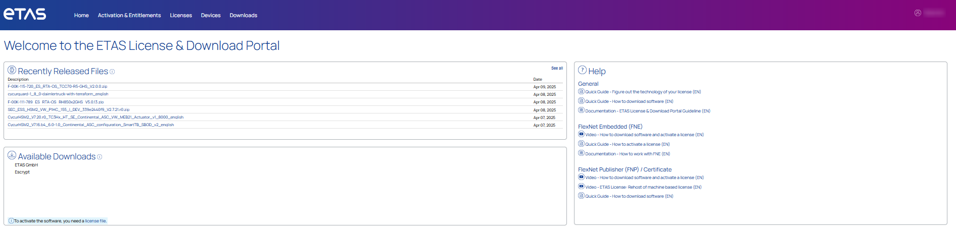 The view Home will give you an overview of available downloads and recently added download files of your ordered product(s).