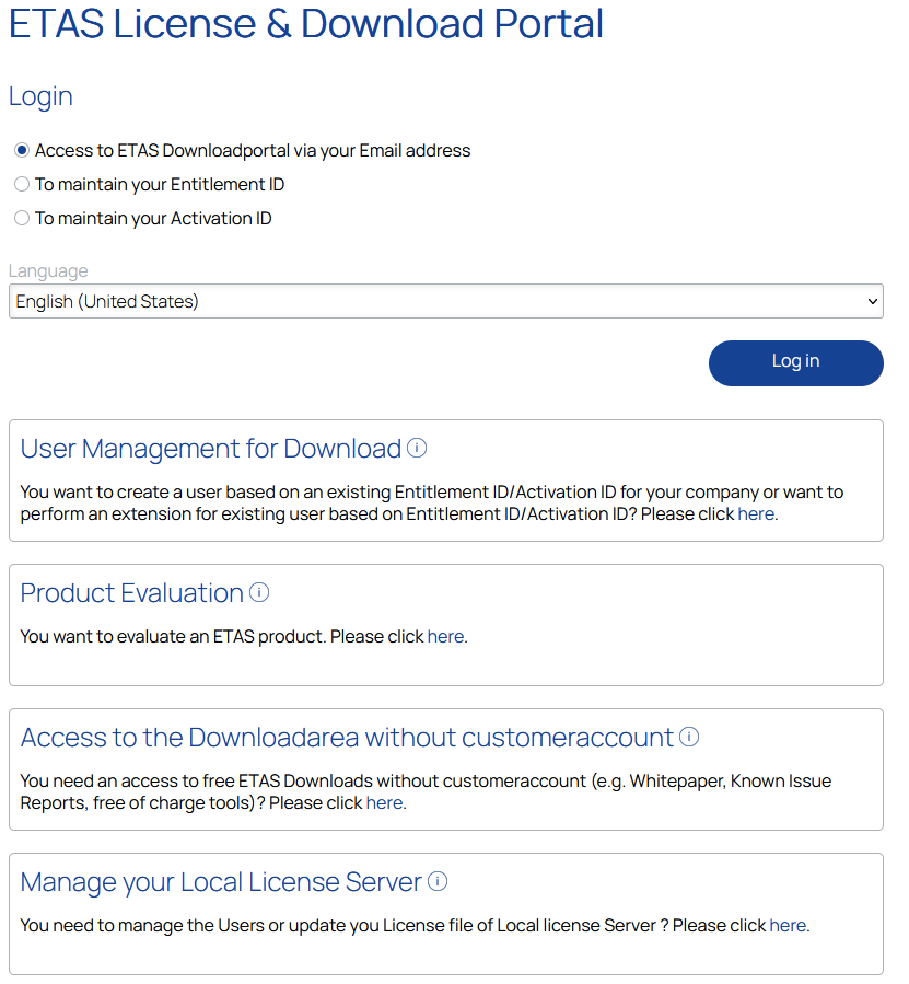 Il existe plusieurs options pour entrer dans le portail https://license.etas.com/: