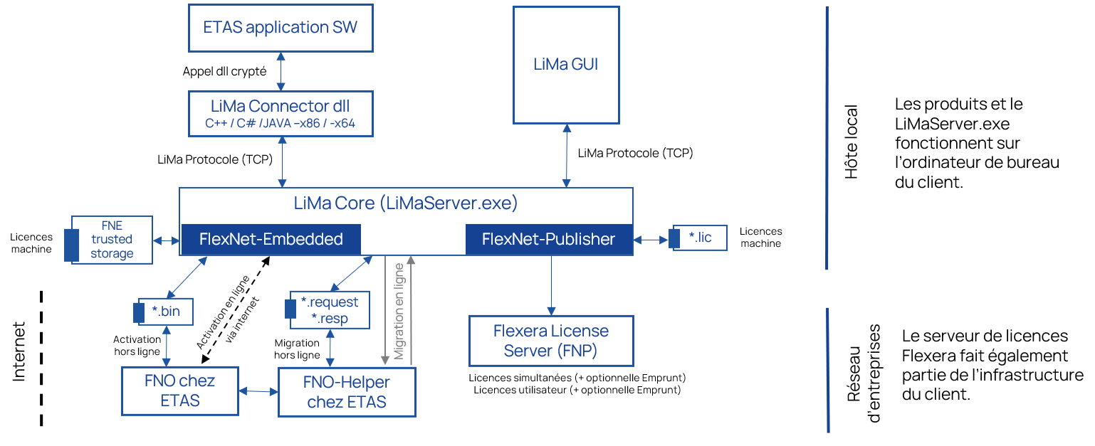 Le Gestionnaire de Licence ETAS (LiMa) dispose d'un seul noyau LiMa Core (LiMaServer.exe) qui est construit en tant que composant x86 C++ et permet de connecter plusieurs applications ETAS sur différentes plateformes pour communiquer en utilisant TCP/IP via un hôte local :