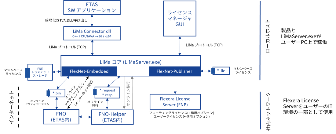 ETASライセンス&ダウンロードポータル(LiMa)のコア部分は、「LiMaコア」(LiMaServer.exe)と呼ばれています。このコアは、x86 C++コンポーネントととしてビルドされており、ローカルホスト経由のTCP/IP通信により、プラットフォームの異なる複数のETASアプリケーションに接続することができます。