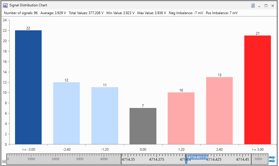 The Signal Distribution Chart is an instrument for statistical analysis. The chart is calculated based on the signal values at a given point in time. In the chart, the height of each bar represents the number of signals that fall within the defined value range of the respective bucket.