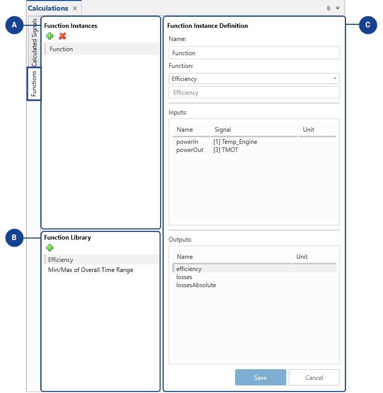 Champs pour définir une instance Pour définir une instance, sélectionnez dans le menu déroulant l'une des fonctions disponibles. Pour créer un mappage entre signaux de mesure et entrées de fonctions, glissez et déposez les signaux de mesure dans le bloc Èntrées. Le bloc Sorties vous indique quels calculs la fonction prédéfinie choisie réalisera. |