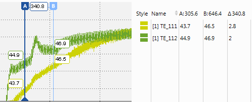 Part in the graphical view of the oscilloscope to analyze y values, differences to other cursors, and time values. are used to get more precise values at certain time stamps. Moreover cursors enable to determine differences between samples values and in view of time. The oscilloscope shows directly in the graph the values of the signals at the time stamp of the cursors as well as the difference on the y-axis between the cursors.