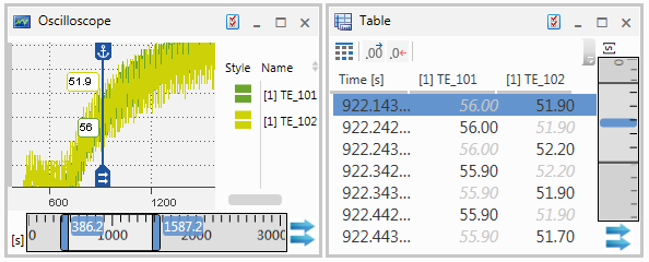 Im synchronisierten Modus wird der Zeitstempel der Synchronisierung in der zweiten Zeile blau hervorgehoben. Befindet sich der Zeitstempel der Synchronisierung zwischen den ersten beiden Zeilen, wird eine blaue Linie zwischen diesen Zeilen angezeigt. Sie können den Synchronisationszeitstempel in eine andere Zeile der Tabelle verschieben. Weitere Informationen finden Sie unter Verschieben des Synchronisationszeitstempels. Wenn Sie die Synchronisation beenden, ändert sich die Farbe der hervorgehobenen Zeile von blau zu grau, um die aktuelle Zeit des Zeitschiebers innerhalb der Messdaten anzuzeigen.