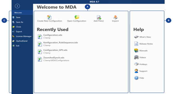 Lorsque vous démarrez MDA V8, la page d'Accueil apparaît. La page d'accueil facilite votre prise en main du logiciel et vous fournit une vue d'ensemble des principales fonctionnalités. Pour retourner à la page d'Accueil, cliquez sur le ruban Accueil.