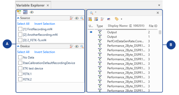 Dans l'Explorateur de variables, il existe temporairement des emplacements différents pour définir les filtres. Selon la disponibilité des métadonnées dans un fichier de mesures, vous avez plus ou moins d'options pour filtrer la liste des variables.