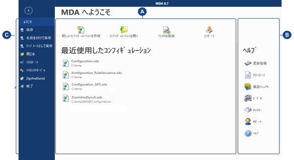MDA V8を起動すると、最初にMDAのホームページが開きます。このページから主要な機能に直接アクセスすることができるので、簡単にMDAの操作を開始することができます。MDAの各操作画面からホームページに戻るには、リボンの ホーム タブをクリックします。