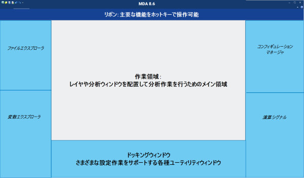 MDAウィンドウ上部のリボンではグローバルアクション(全体的な操作)を実行することができます。このうち主要なアクションにはホットキーが割り当てられています。