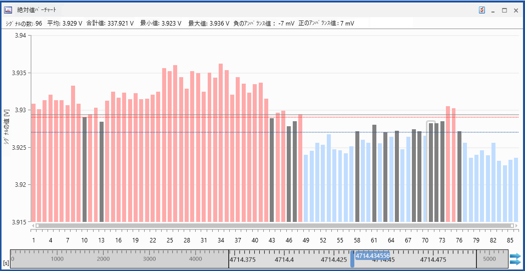 絶対値バーチャートではシグナル値の概要が把握でき、指定された時点において下限値または上限値を超えたシグナルを特定することができます。